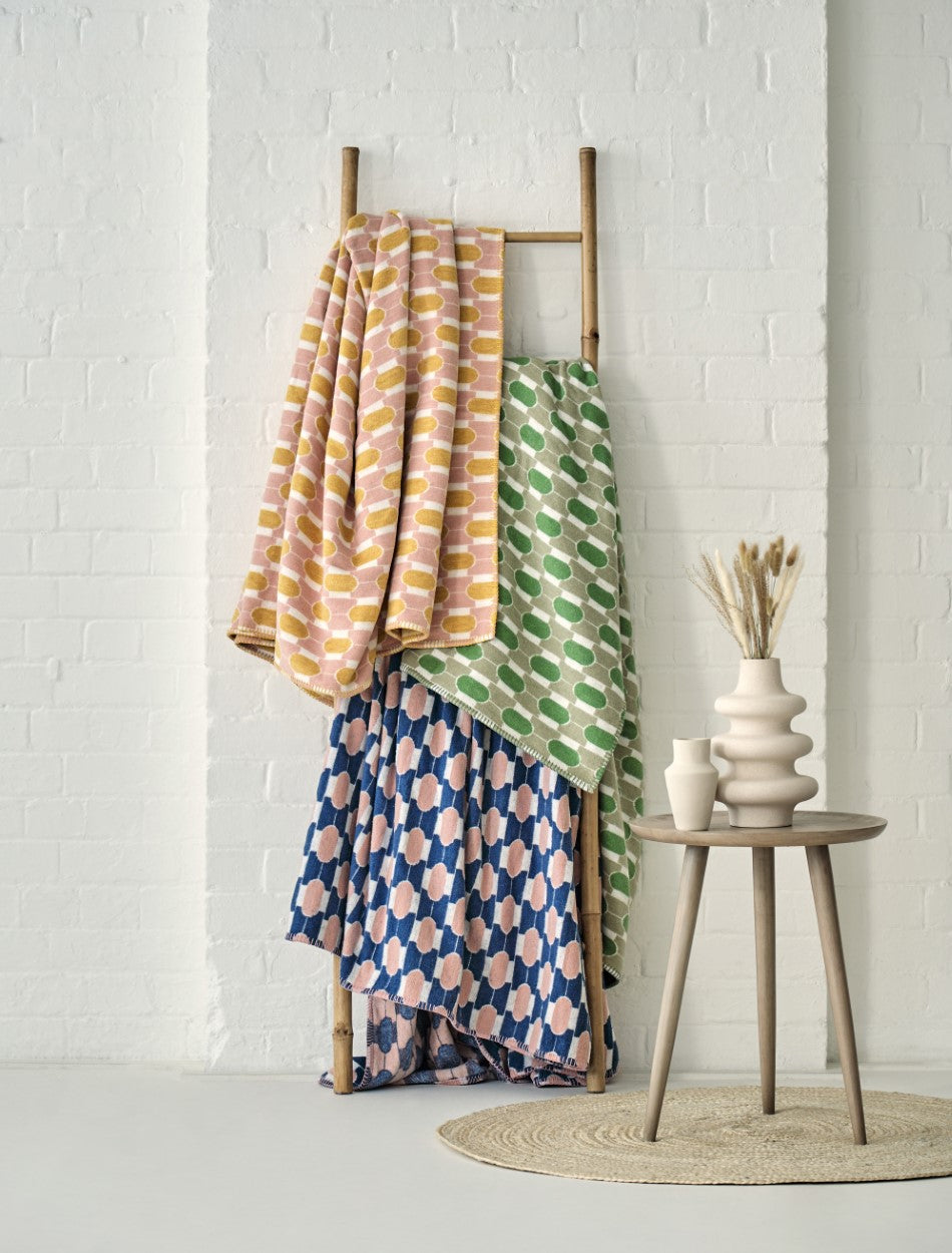 Wool blankets in a distinctive tone-on-tone design, inspired by the colours of British flowers, plants and landscapes