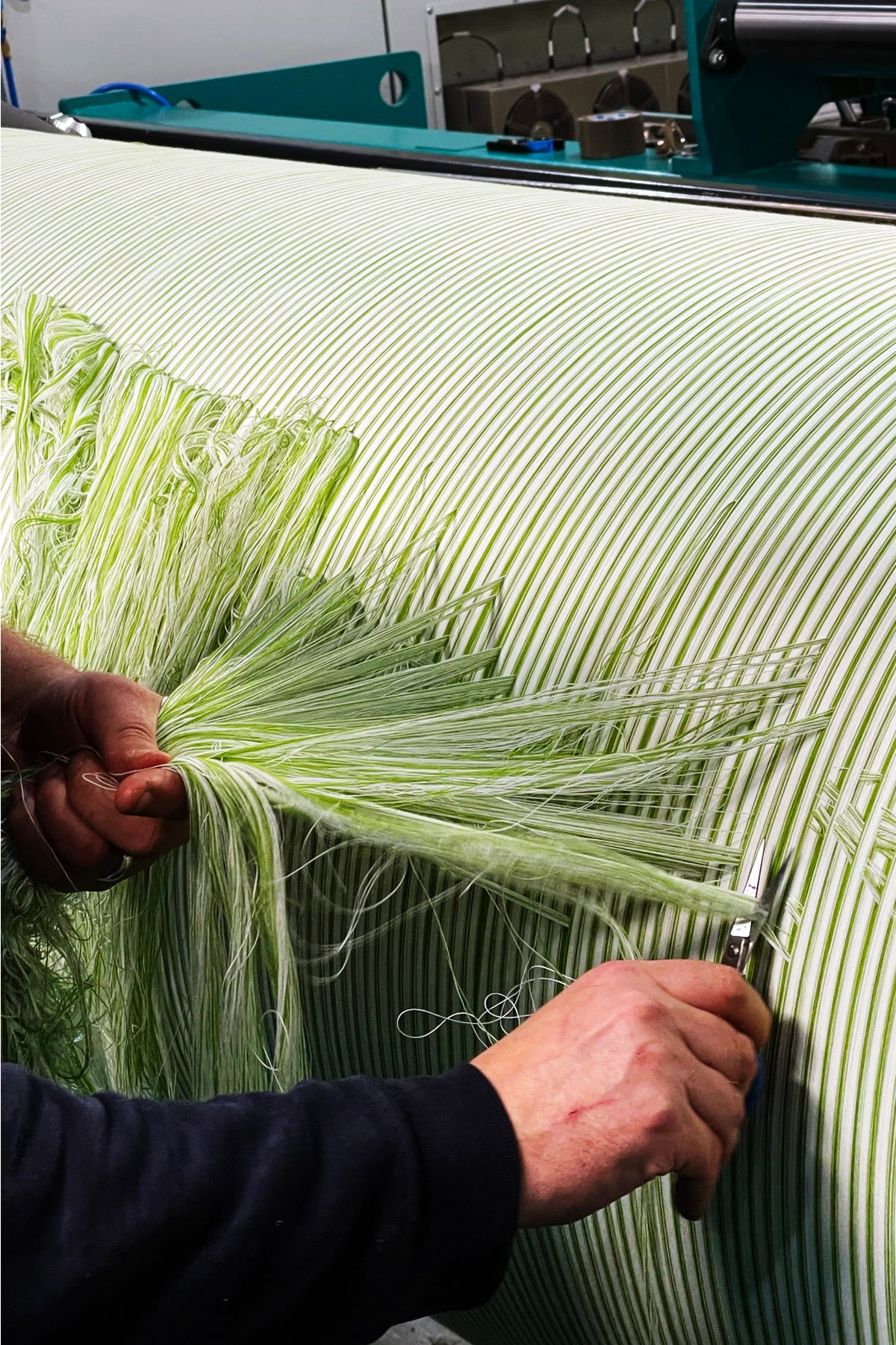 Weaving on jacquard looms allows us to get creative with curved and diagonal lines, incorporating multiple colours into each design.